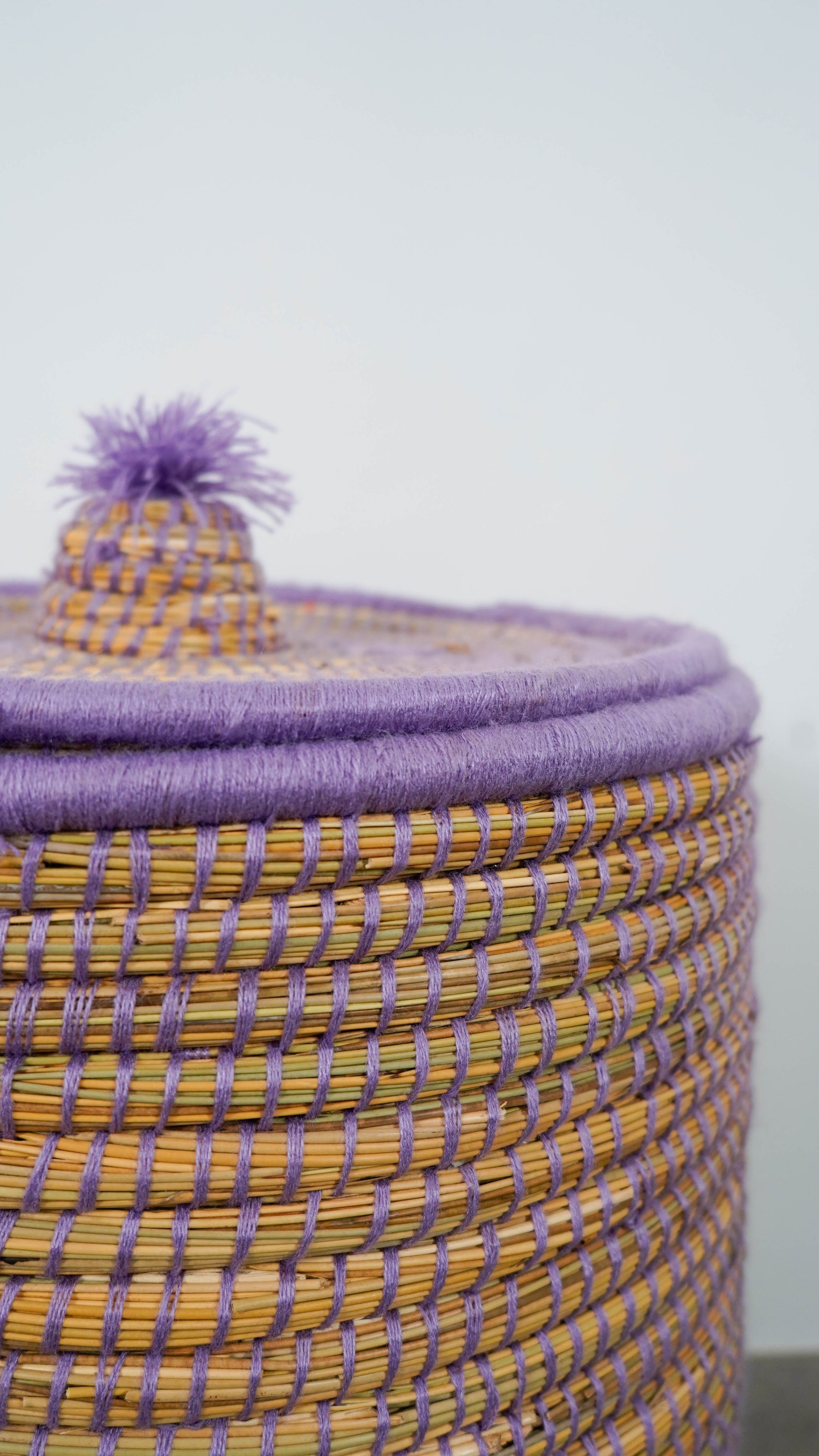 This model with a lid, made of plant fiber and openwork wool for a pop of color, is entirely handcrafted in Morocco by Issam and his father.