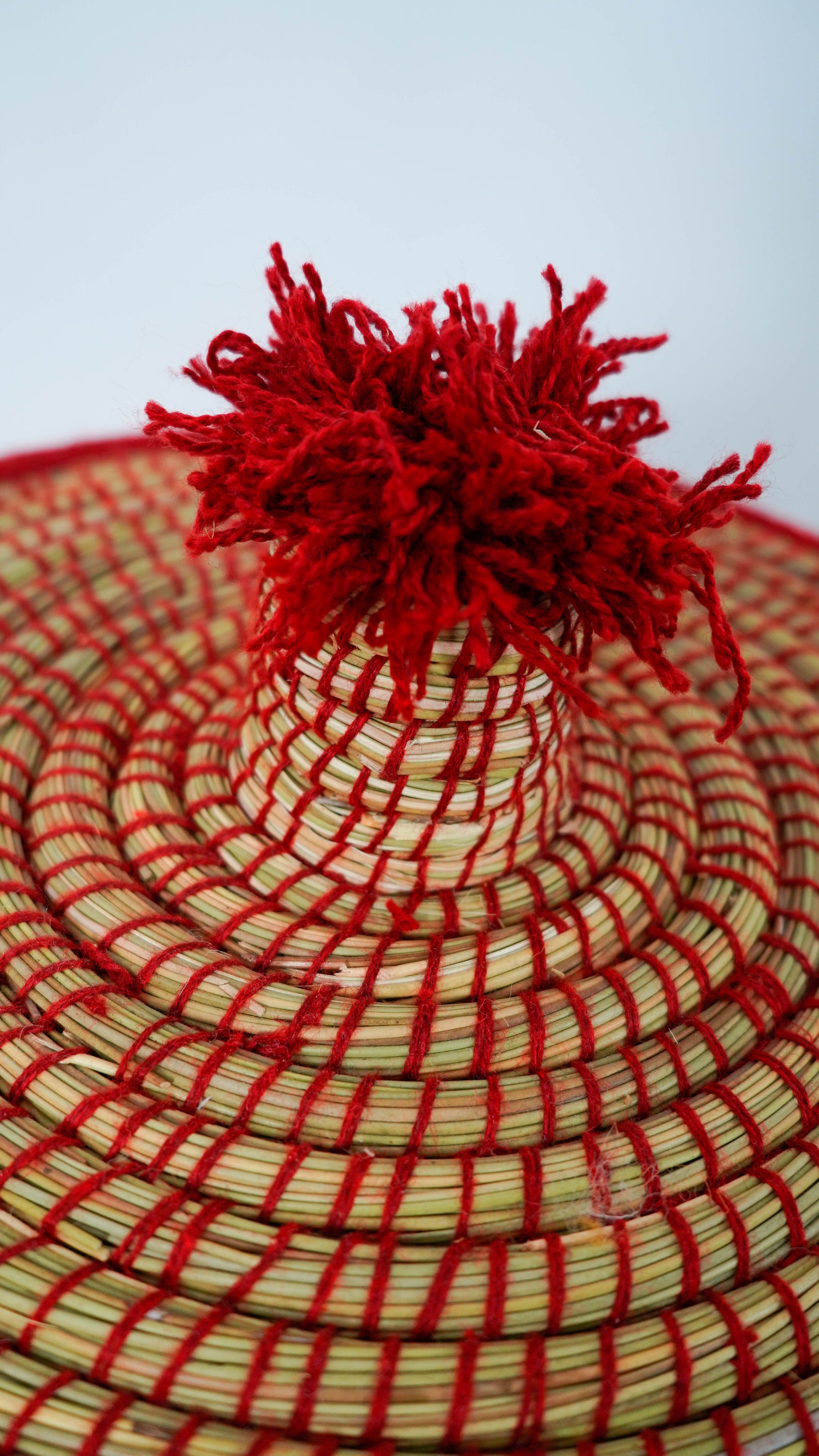 This model with a lid, made of plant fiber and openwork wool for a pop of color, is entirely handcrafted in Morocco by Issam and his father.